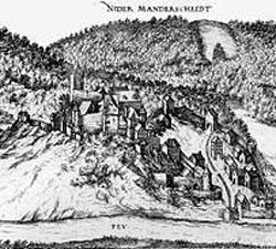 Die zweite Tochter, Gräfin Elisabeth (+/- 1530) hatte am 28.April 1560 in Schleiden/Eifel den Grafen Dietrich VI. zu Manderscheid,(*1538) Blankenheim und Virneburg, Herr zu Schleiden und Daun, Kronenburg, Saffenburg und Neuenburg (Neufchateau) geheiratet. Graf Ludwigs ererbte Ardennen-Grafschaften Rochefort, Montaigu, Agimont, Orchimont, Herbumont lagen jetzt in direkter Nachbarschaft des Schwiegersohns. Das erleichterte ihm später die Unterbringungen seiner Begleiter auf seiner Englandreise. Graf Dietrich VI. starb m 01.3.1593 in Kerpen, die Ehe war kinderlos geblieben. Ein Jahr später heiratete Elisabeth den Witwer Freiherr Wilhelm von Criechigen (*1550-+1597); sie starb am 26.6.1612 |