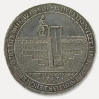 Ausbeutetaler 1717, Stolberg Stempel von Christian Wermuth und Johann Jeremias Gründler. Auf das Reformationsjubiläum und den Erfolgreichen Bergbau. Die geharnischten Brustbilder der beiden Brüder mit großen Allongeperücken und im Mantel nebeneinander nach rechts, am Arm des vorderen Signatur C.W. / Bergmann am Haspel über Grubenaufriss mit einer Strecke und einem Ort im Strossenbau, am Haspelseil Kübel mit der Aufschrift: IUBI-LEVM, unter dem Abschnitt Datum und Münzmeisterinitialen. Friederich 1581, Davenport 2799, Müseler 66.1/58, Slg. Friederich 856 (130 Schulz 1016/11 (Siehe Doerk, E.(2014) Reformation in Nummis S.198) |