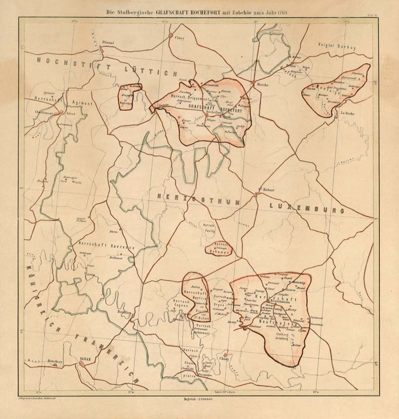 im heutigen Belgien, sowie weiterer Besitzungen, kann auch im Westen des Reiches und damit politisch in der unmittelbaren Umgebung Kaiser Karls V. Fuß gefasst werden. Nach mehreren zeitweiligen Landesteilungen bilden sich im 17. und 18. Jahrhundert die bleibenden Linien Stolberg, Wernigerode und Roßla. Die Linie Stolberg-Gedern wird bereits 1742 in den Reichsfürstenstand erhoben, die anderen Linien des Hauses 1890 bzw. 1893.