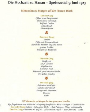 Am 09. Juni verließ nun der prächtige Brautzug Schloss Königstein mit Rossen und Wagen in Richtung Hanau. Juliana trug ein Brautkleid „von güldenem Stück und Karmesin-Samt“, was allein schon 100 Goldgulden gekostet hatte ! Auf halber Strecke, bei Bergen, kam ihnen der Bräutigam mit Gefolge, u.a. die Grafen zu Isenburg-Büdingen, Die Zahl der geladenen Gäste belief sich auf ca. 350 Personen. Hinzu kamen noch die Amtsleute, Hofgesinde, höhere Dienerschaft, teils auch noch mit eigener Bedienung. |
